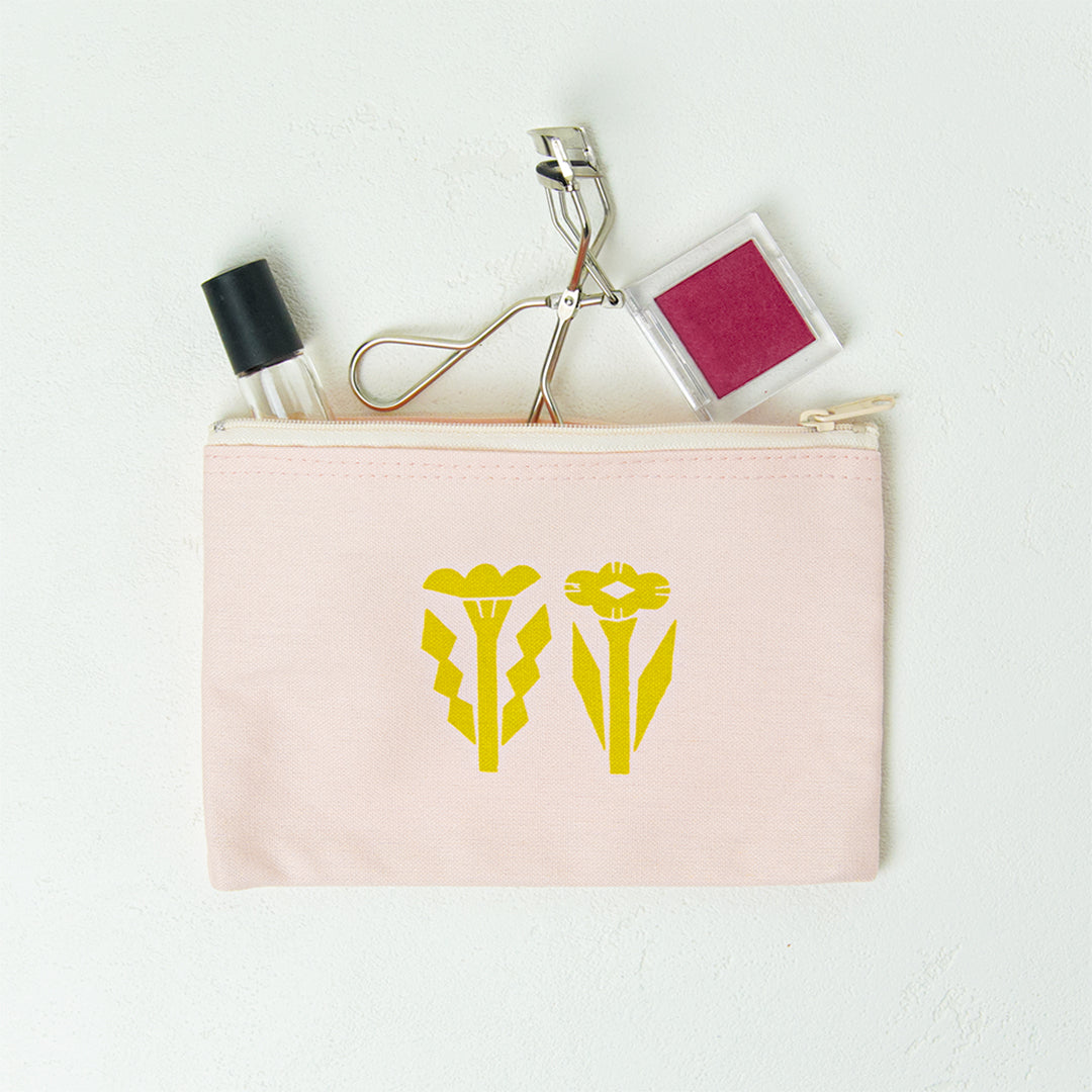 ますたにあやこさんのイラストがプリントされたポーチ。